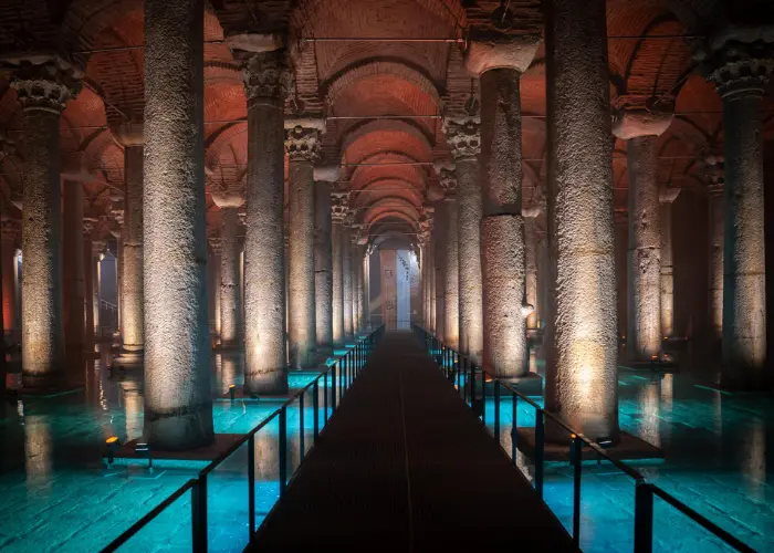 The Basilica was a Roman cathedral. The Cisterna Basilica, also known as the Cistern, is the largest of several hundred ancient cisterns in Istanbul, Turkey. The cistern, which is 150 meters (490 feet) southwest of Hagia Sophia on the historical peninsula of Sarayburnu, was built in the 6th century during the reign of Byzantine Emperor Justinian I. It is now stored with only a small amount of water inside the space for public access. When you visit Istanbul, pay a guided visit to the Basilica Cistern, which holds a significant position among Istanbul's historical sites.