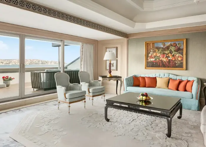 Sultan Suite is the most expensive hotel room in Istanbul with 50.000 Euro price per night. Located in the historical Palace building, Sultan Suite is one of the largest suites in Europe. It offers panoramic views of the Bosphorus with its high-sash windows. Sultan Suite, consistently ranked as the best suite in the world, has a magnificent living room with a dining area for 12 people, a specially decorated large bedroom, and a guest room. The royal Sultan Suite guests have the privilege of a chauffeur-driven luxury transfer service and point-to-point city transfers with the hotel's 1974 model classy Rolls Royce Silver Shadow throughout their stay.