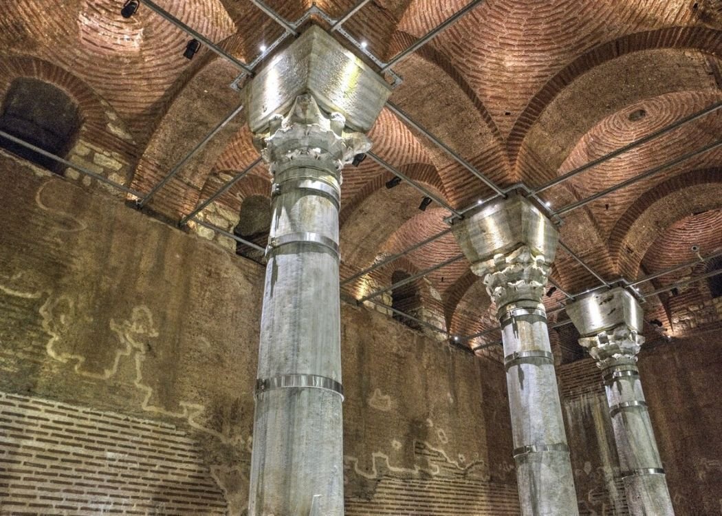 Throughout Istanbul's history, structures for water storage were essential due to insufficient sources, high population, and frequent sieges. The Şerefiye and Basilica cisterns are notable examples, supplying water to various parts of the city. The Serefiye (Theodosius) Cistern, covering a 24m x 40m area with a ceiling height of 11 meters, features 45 sail vaults and 32 columns adorned with Corinthian capitals made of specially imported Marmara Island marble. Its inner walls are lined with watertight plaster, and its design ensures pressure resistance with curved corners and thick walls.